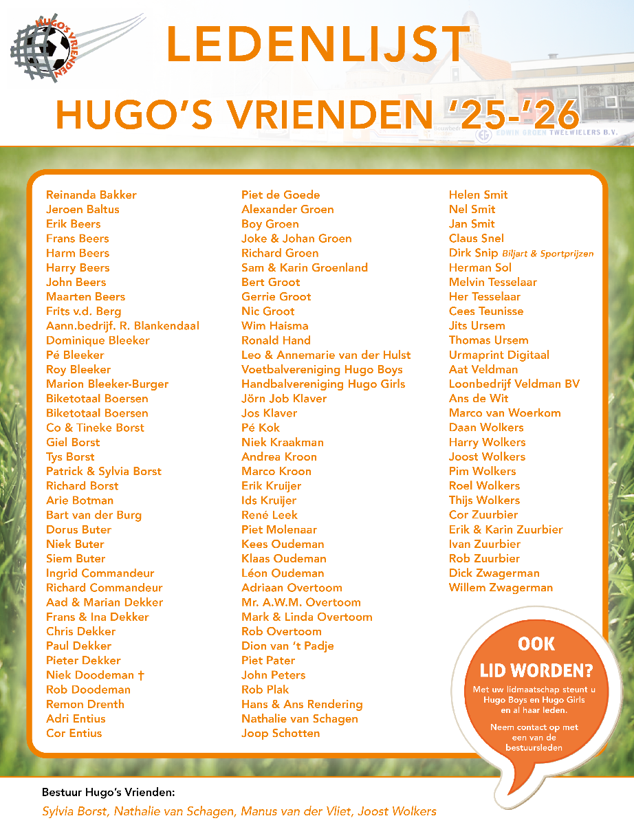 Jaarlijks doneren meer dan 100 donateurs een bedrag van € 50,00 per seizoen om dit te bewerkstelligen. Van de gelden worden nuttige zaken voor Hugo Boys en Hugo Girls gerealiseerd.